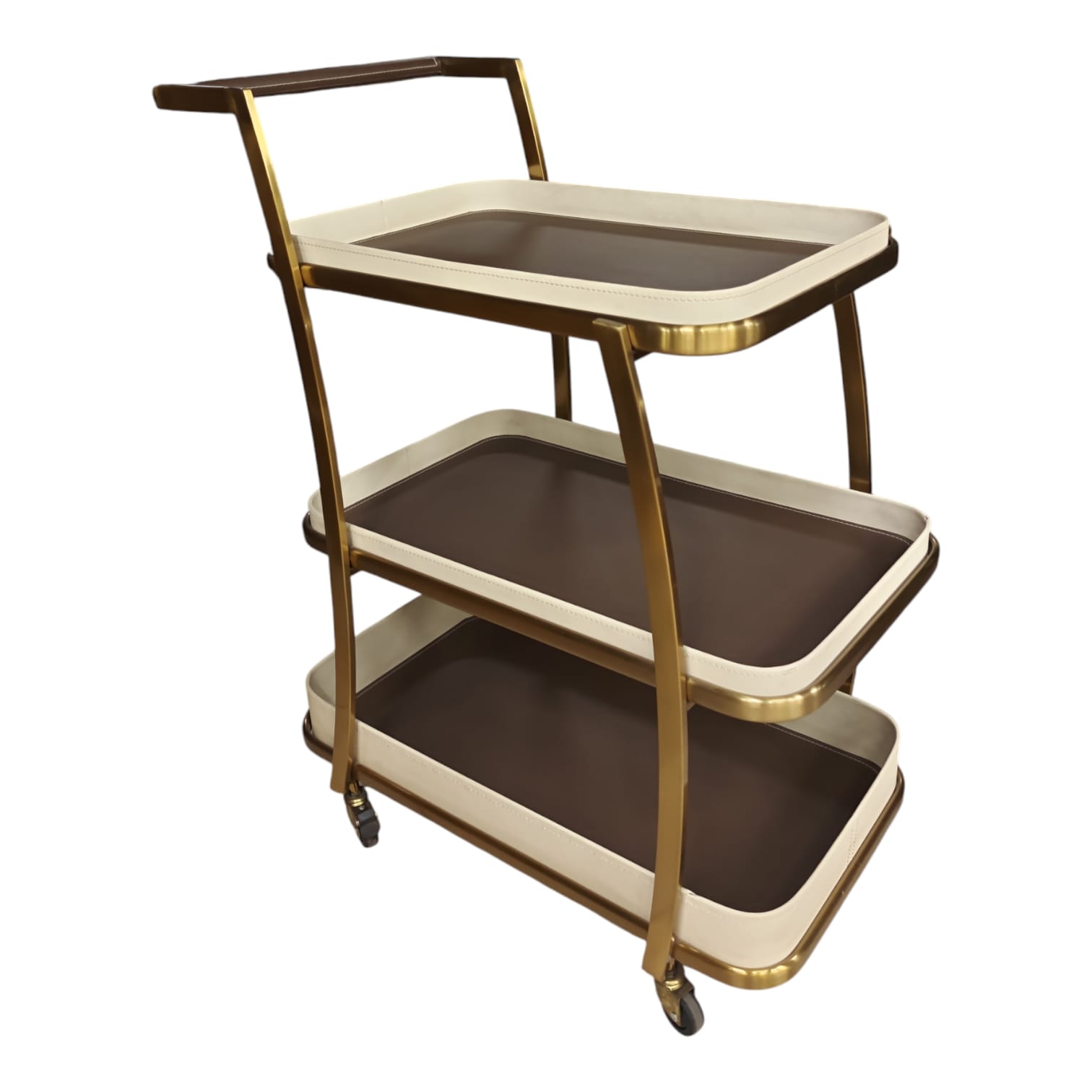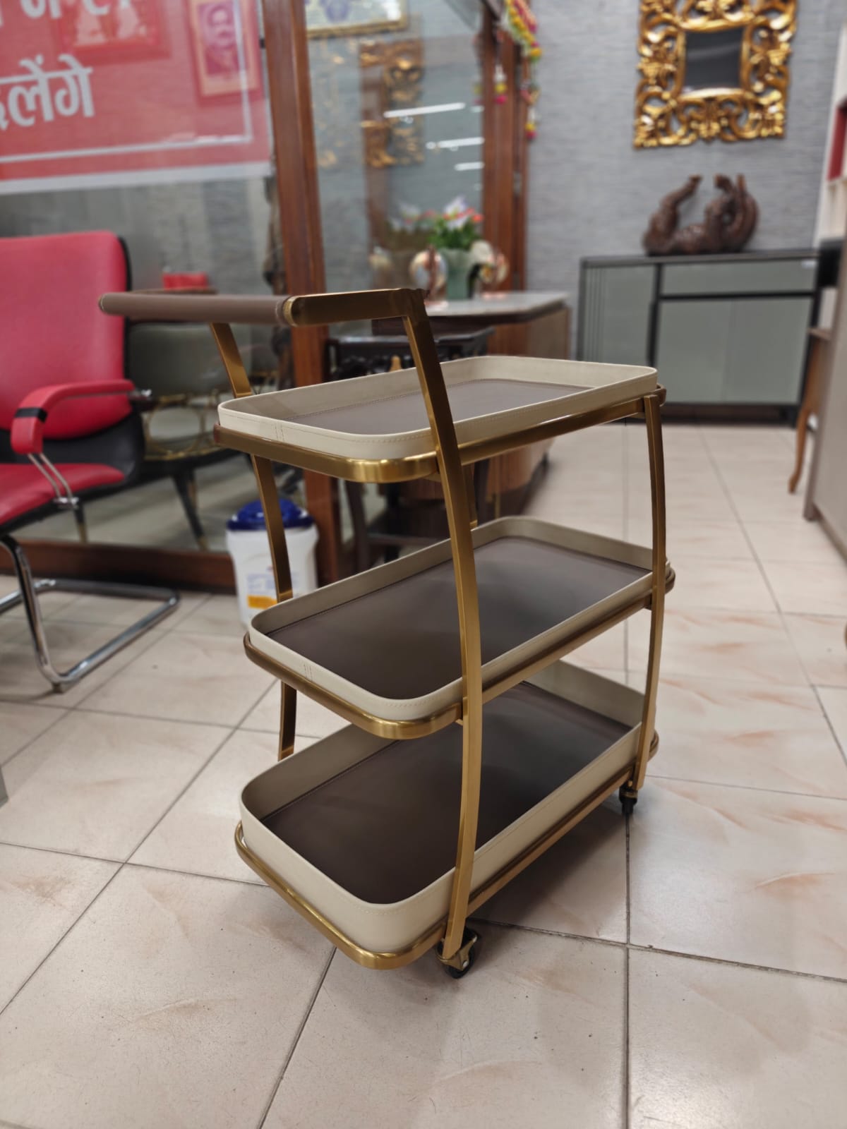 Three-tier design for maximum storage and organized servingPremium metal frame with gold finish for a stylish contemporary lookBrown trays with cream safety edges to prevent spillageSmooth-glide wheels for mobility and convenienceErgonomic push handle for comfortable handlingVersatile use: bar service, tea & snacks, hospitality, or decorative display