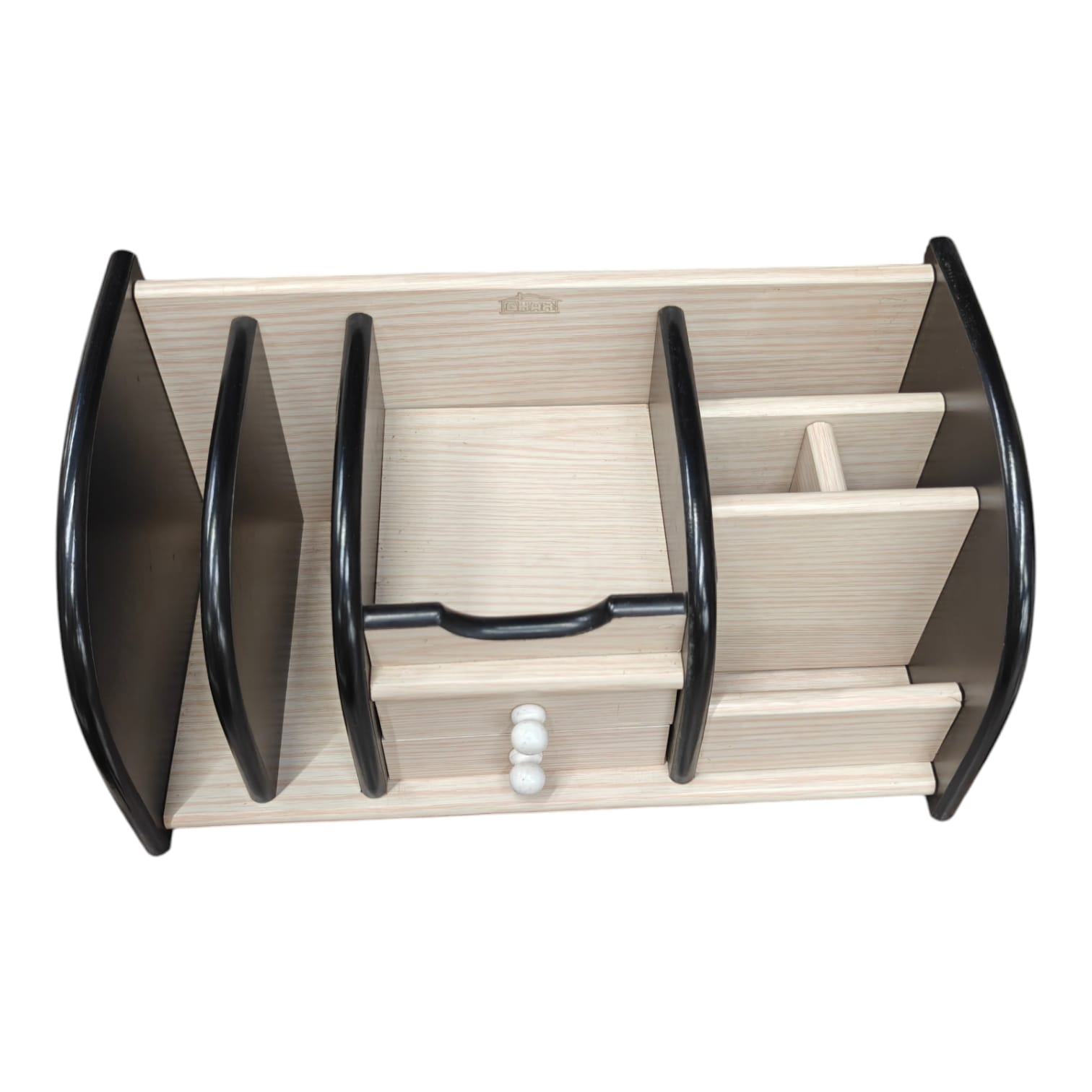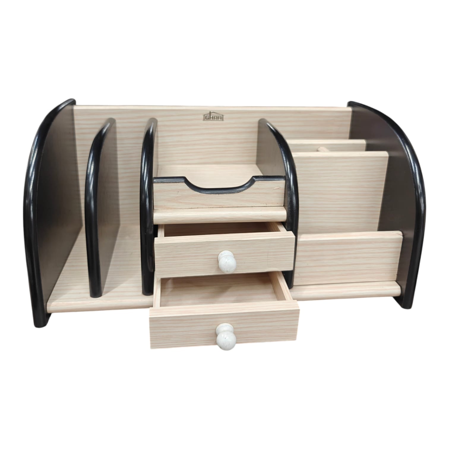 A compact and stylish desk organizer featuring multiple compartments for visiting cards and stationery, along with two mini drawers for small essentials. Perfect for maintaining a neat workspace and an excellent choice for corporate use and CORPORATE GIFTING.