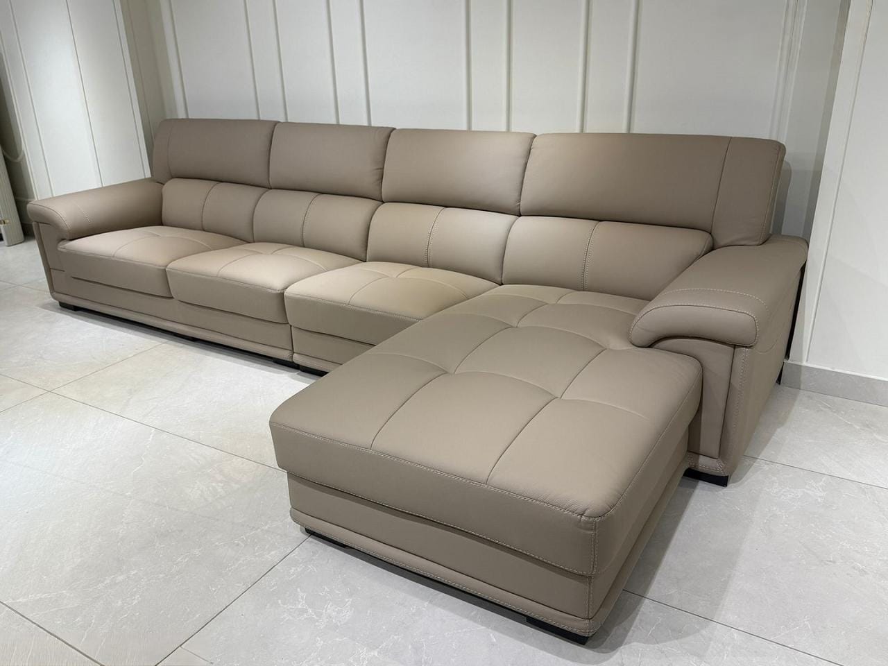Elevate your living space with this premium L-shaped leather sofa, designed to deliver both luxury and long-lasting comfort. Upholstered in high-quality, soft-touch leatherette, the sofa features a refined taupe finish that blends effortlessly with contemporary interiors.The plush, high-density cushioning provides excellent lumbar support, while the generously padded armrests enhance relaxation. Its right-side extended lounger section offers the perfect spot to unwind, stretch out, or enjoy casual family gatherings.