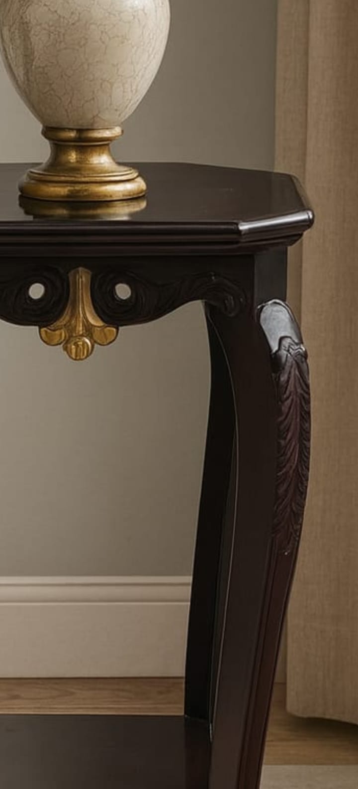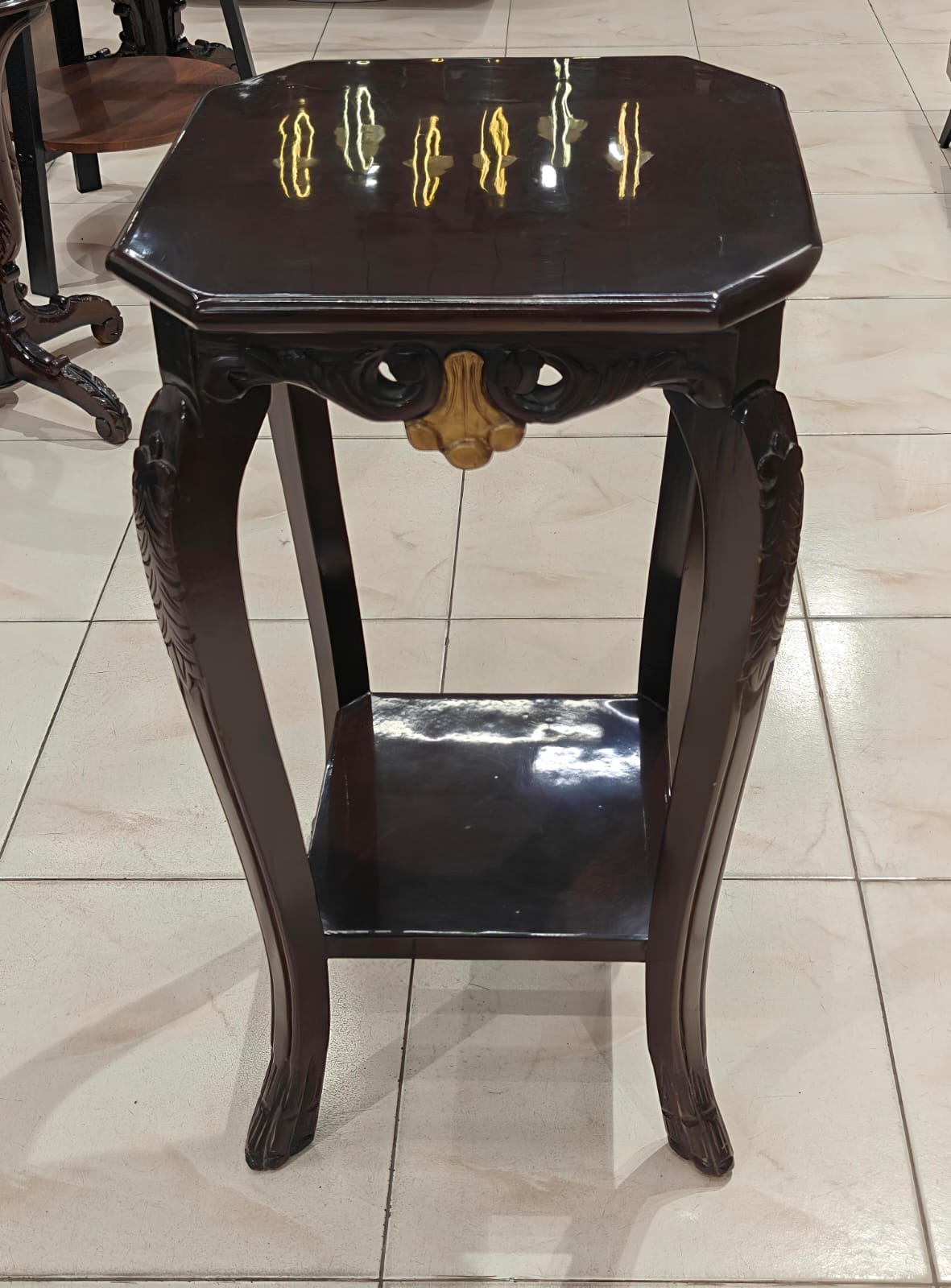 Enhance your interiors with this elegant Heighted Side Table, beautifully crafted from 100% solid teak wood for superior strength and durability. Featuring hand-carved detailing and a rich melamine polished finish, this stand brings a classic touch with a luxurious shine. Its elevated height makes it extremely versatile — perfect to use as a side table, planter stand, showpiece display stand, or an accent pedestal for décor items, lamps, or idols. The sturdy structure ensures long-lasting support while the carved legs add artistic charm, making it a perfect blend of traditional craftsmanship and everyday functionality.