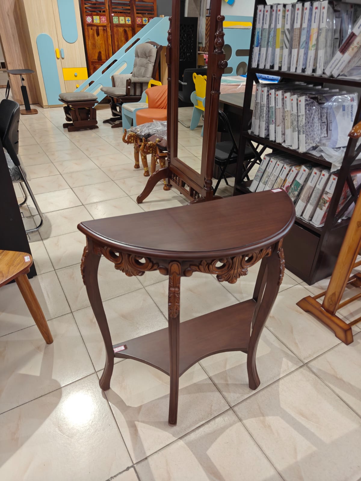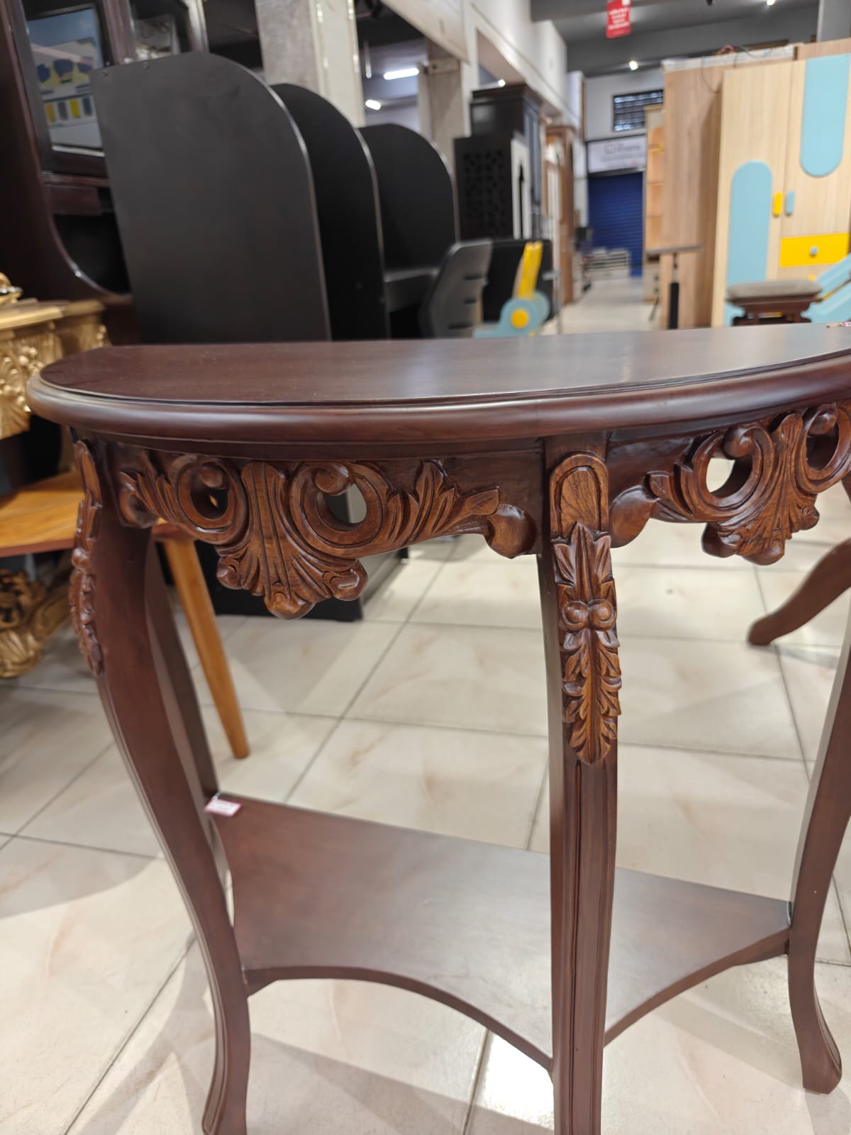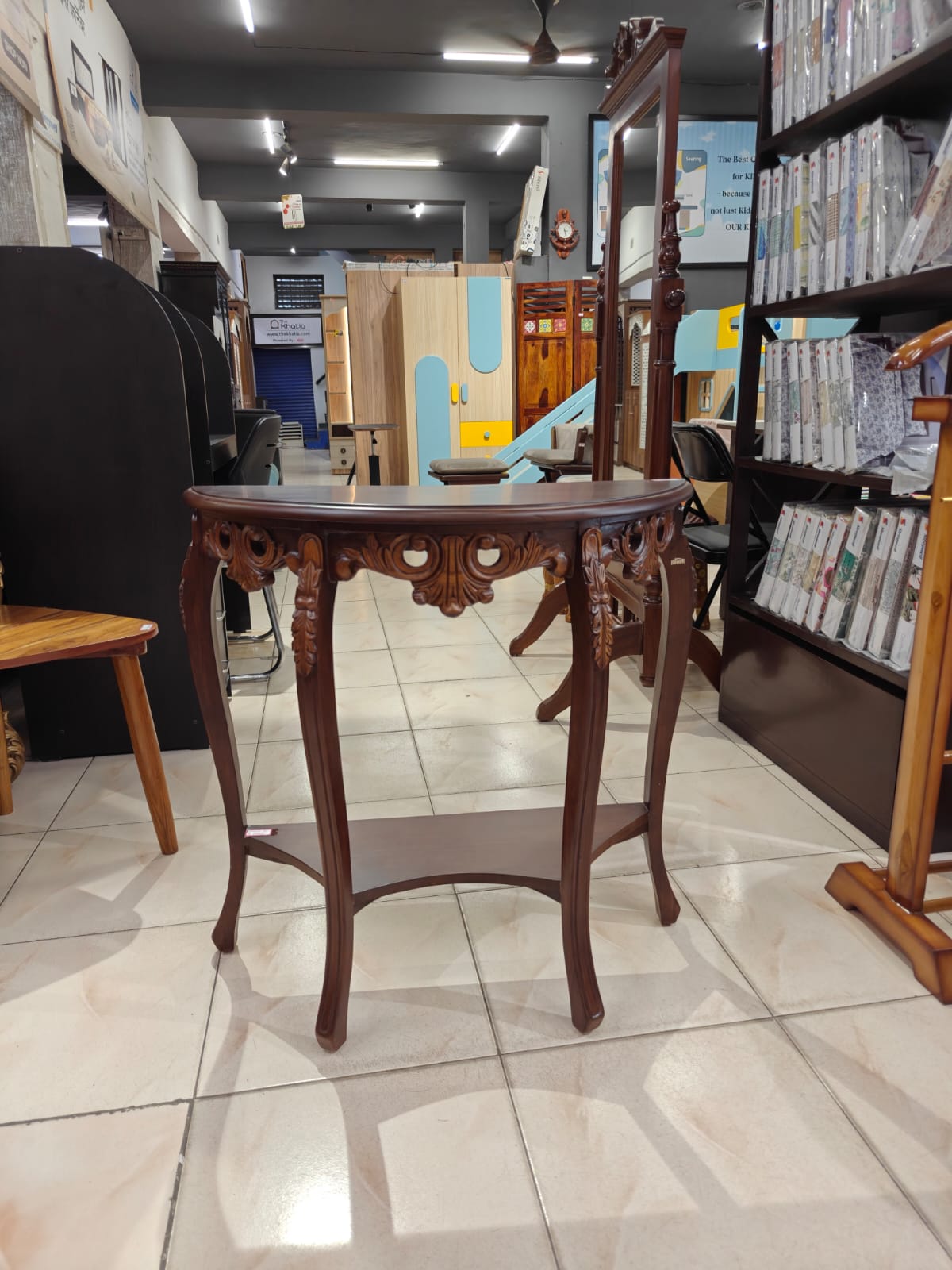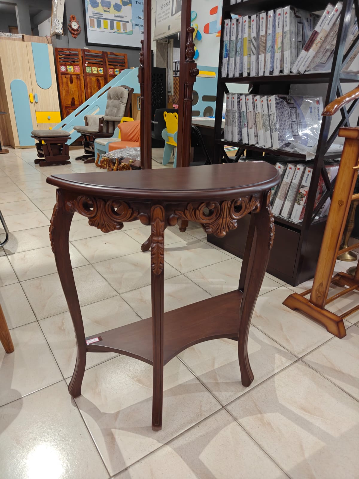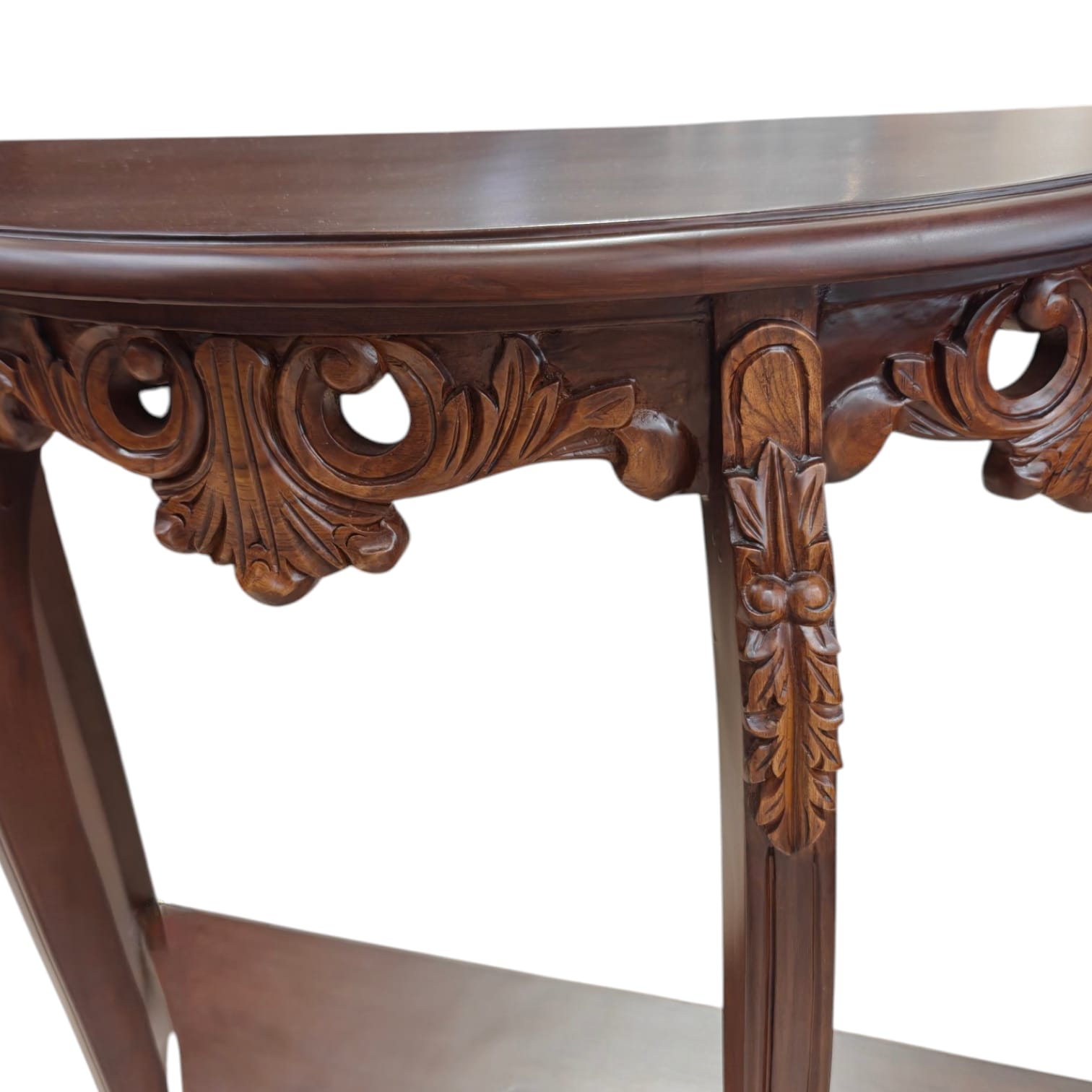 Classic Teak Wood Console – A Statement of Elegance ✨Enhance your interiors with this beautifully crafted 30-inch console table, made from 100% guaranteed teak wood with intricate hand-carved detailing that reflects timeless craftsmanship.Finished in a rich light walnut melamine polish, this console features a stunning dual-tone effect, where the carvings are highlighted in a lighter shade, bringing out the depth and beauty of the design. The natural wood grains remain clearly visible, adding authenticity and character to the piece.Perfect for adding a luxurious and classy touch, this console can be placed in:✔ Entrance or foyer areas✔ Living rooms✔ Hallways or lobbiesFor a complete look, you can also customize and order a matching mirror in the same design, creating a truly elegant setup.🏡 In-house manufactured & exclusively available at GHAR Furniture – where tradition meets fine craftsmanship.