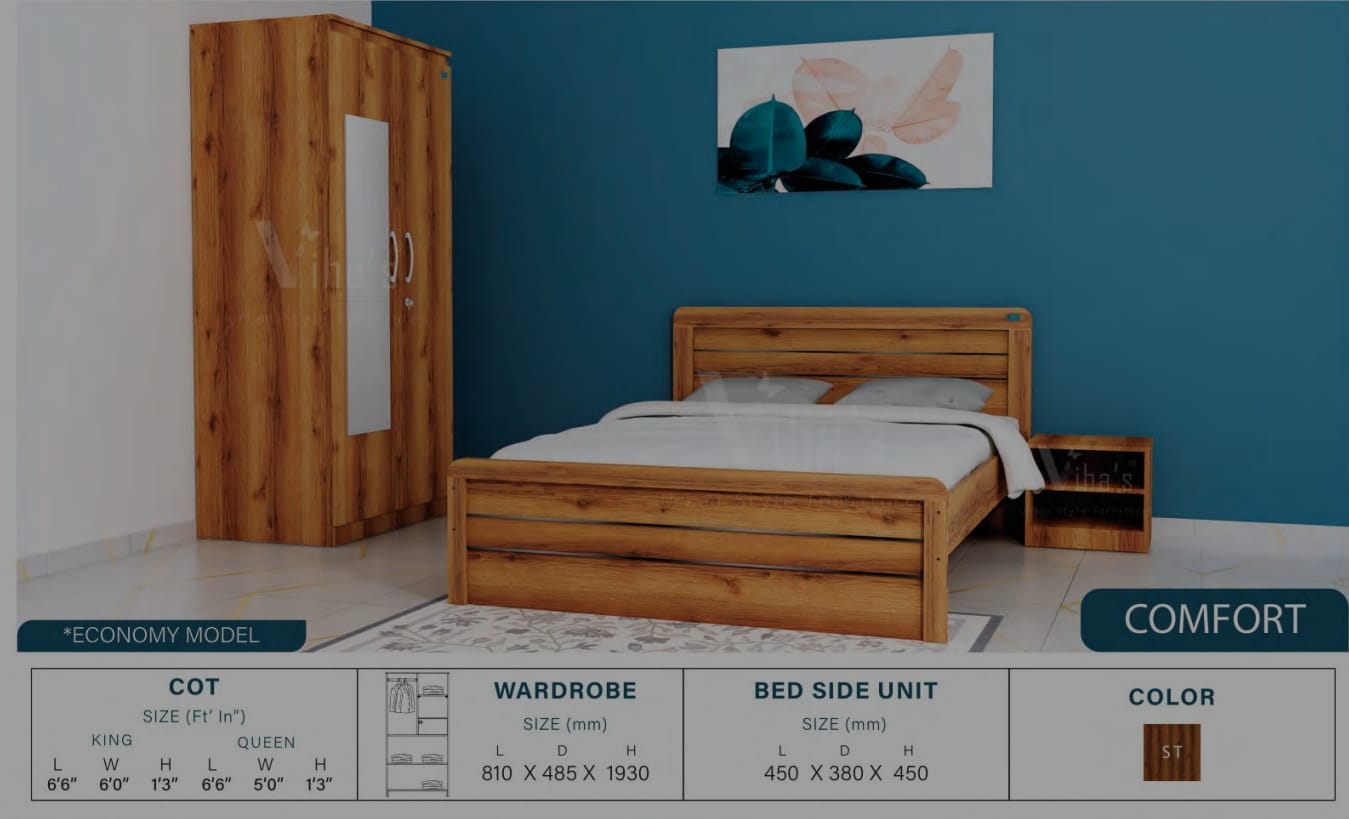 "COMFORT" Bedroom Combo SetThis bedroom combo set is thoughtfully designed to offer a perfect balance of functionality, durability, and elegant style. Made from high-quality PLM board, it features a clean, contemporary look that blends effortlessly with modern interiors.The set includes a king-size bed with an attached one-piece bedside table, providing convenience and a seamless design flow. Complementing the bed is a two-door wardrobe with a full-length mirror, adding both storage efficiency and visual spaciousness to the room.All fittings and hardware used are of superior quality, ensuring smooth usage, strength, and long-lasting performance. Simple in design yet rich in appearance, this combo set enhances the bedroom with a calm, organized, and stylish feel.Combo Set Includes:King-size bed with integrated one-piece bedside tableTwo-door wardrobe with mirrorKey Features:Made from premium PLM boardElegant, minimal, and modern designHigh-quality fittings and hardwareDurable construction and easy maintenanceIdeal for contemporary bedroomsA complete bedroom solution that delivers comfort, storage, and timeless elegance.