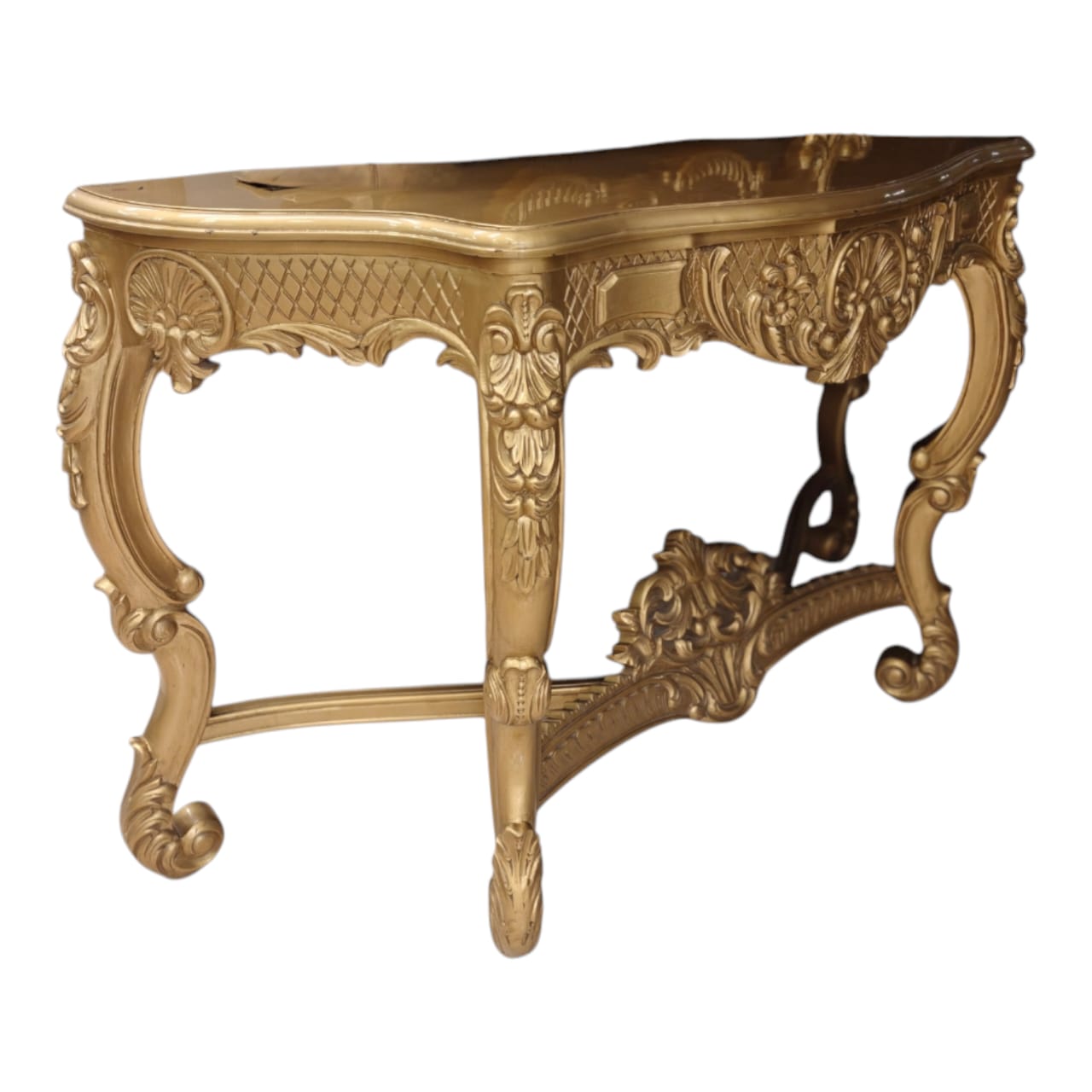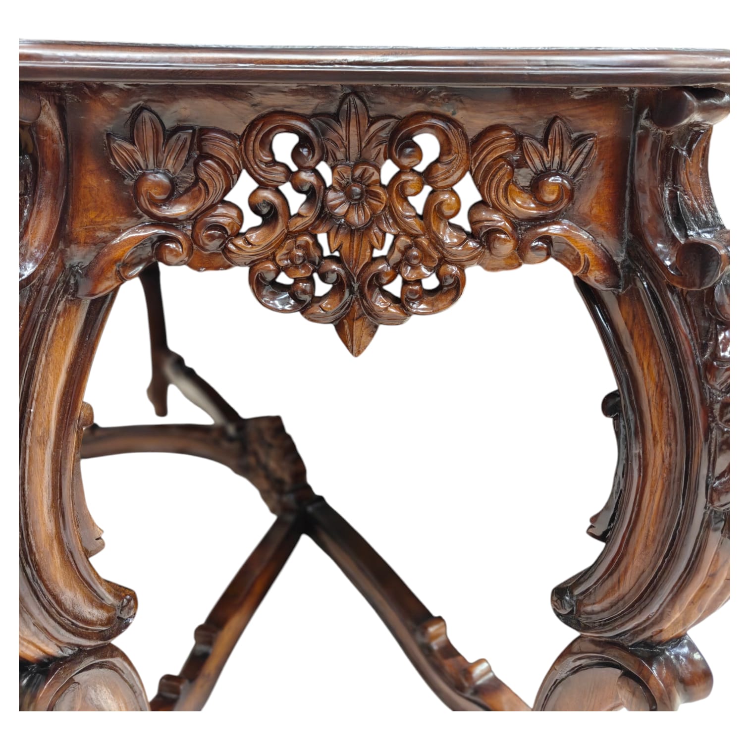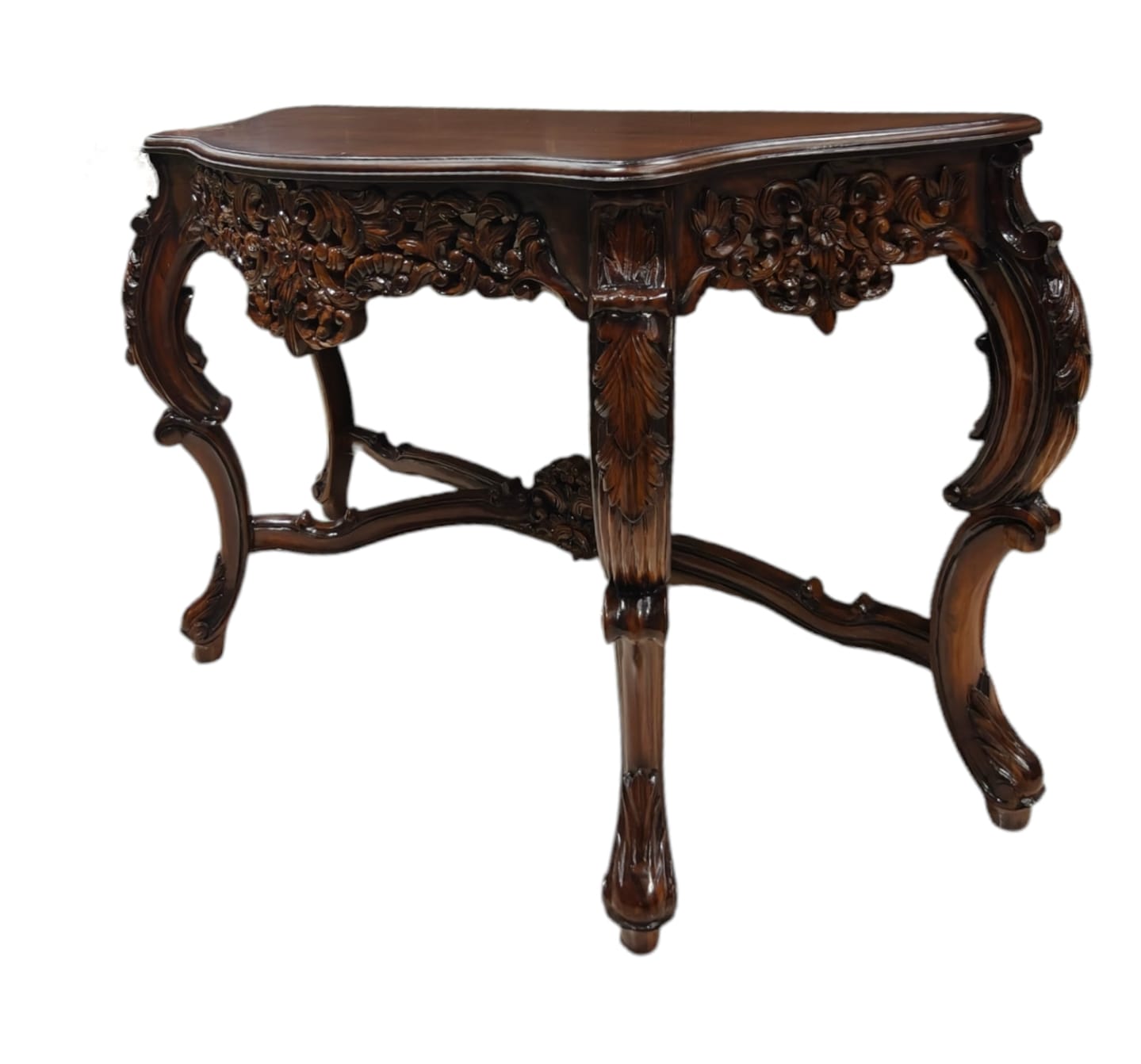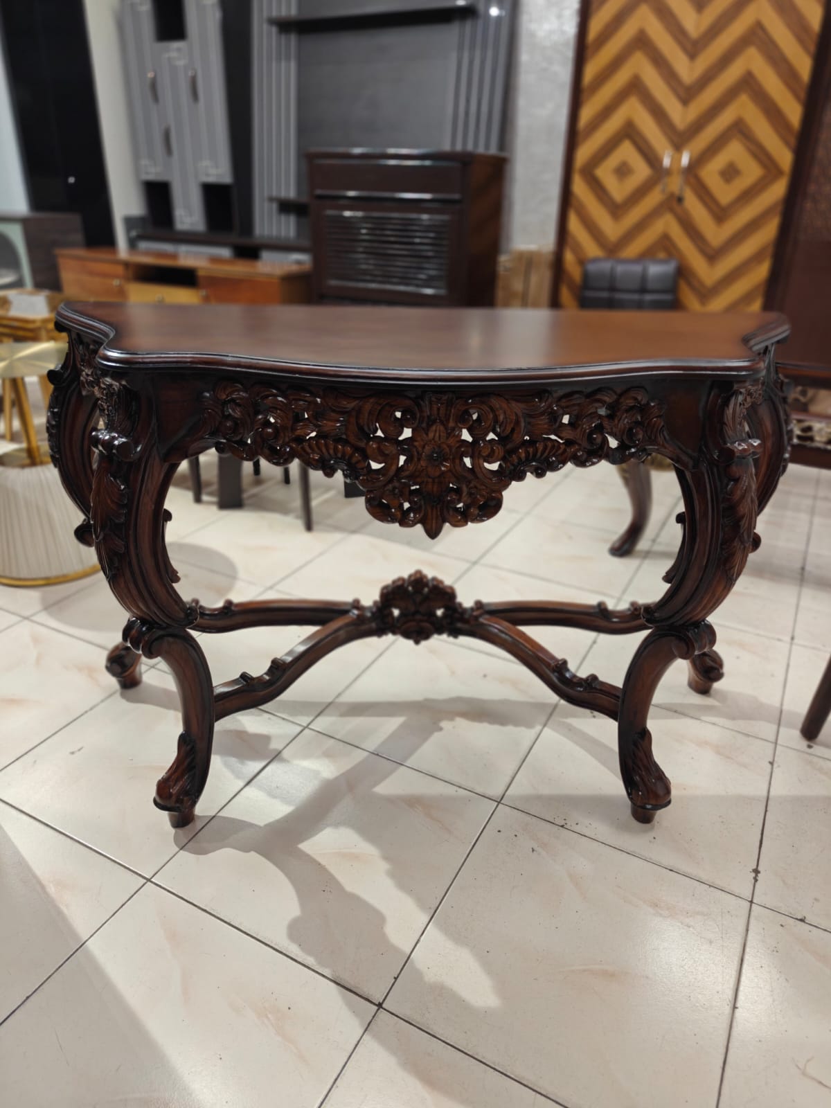 A statement of true luxury and timeless craftsmanship, this console is meticulously handcrafted from 100% solid cake wood, showcasing exceptional depth in carving and form. Each detail is shaped by skilled artisans, making every piece unique and exclusive.The rich walnut melamine polish enhances the natural grain of the wood while providing a flawless, elegant finish that speaks of sophistication and durability. The heavy carved structure, graceful curves, and solid build lend this console a regal presence, perfect for luxury residences and premium interiors.Exquisite design. Exquisite quality. Uncompromising luxury.This console is not just furniture—it is heritage craftsmanship transformed into luxury living.