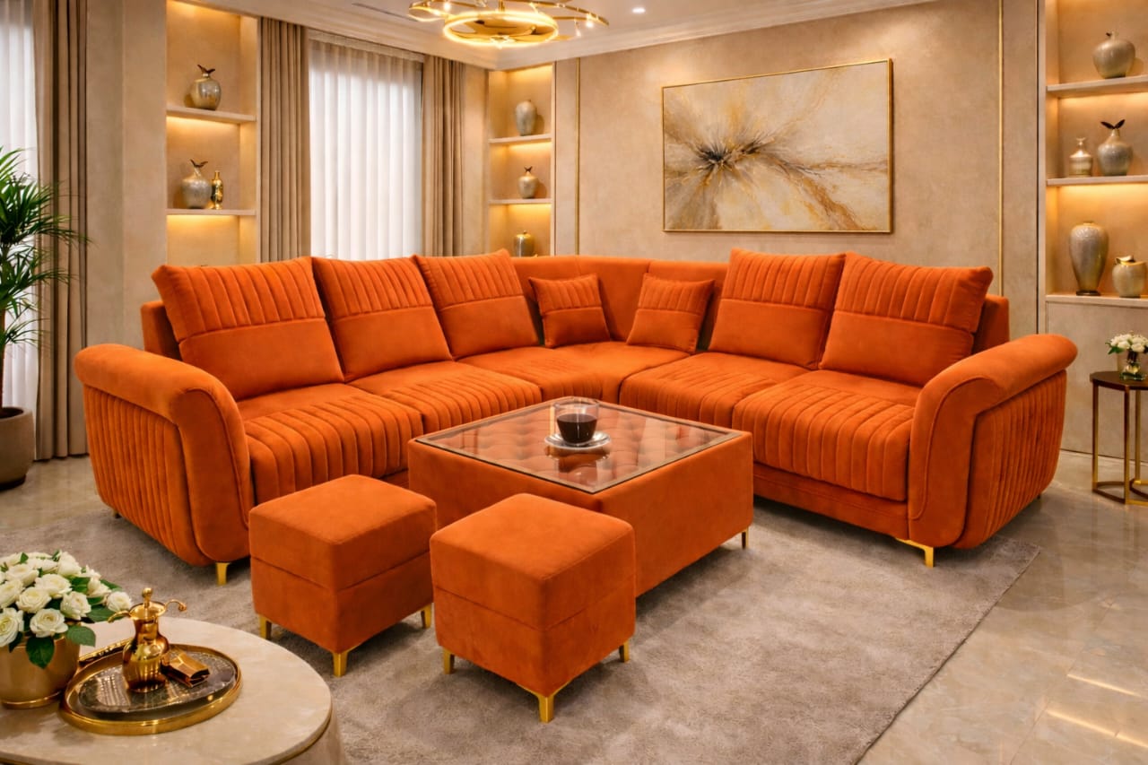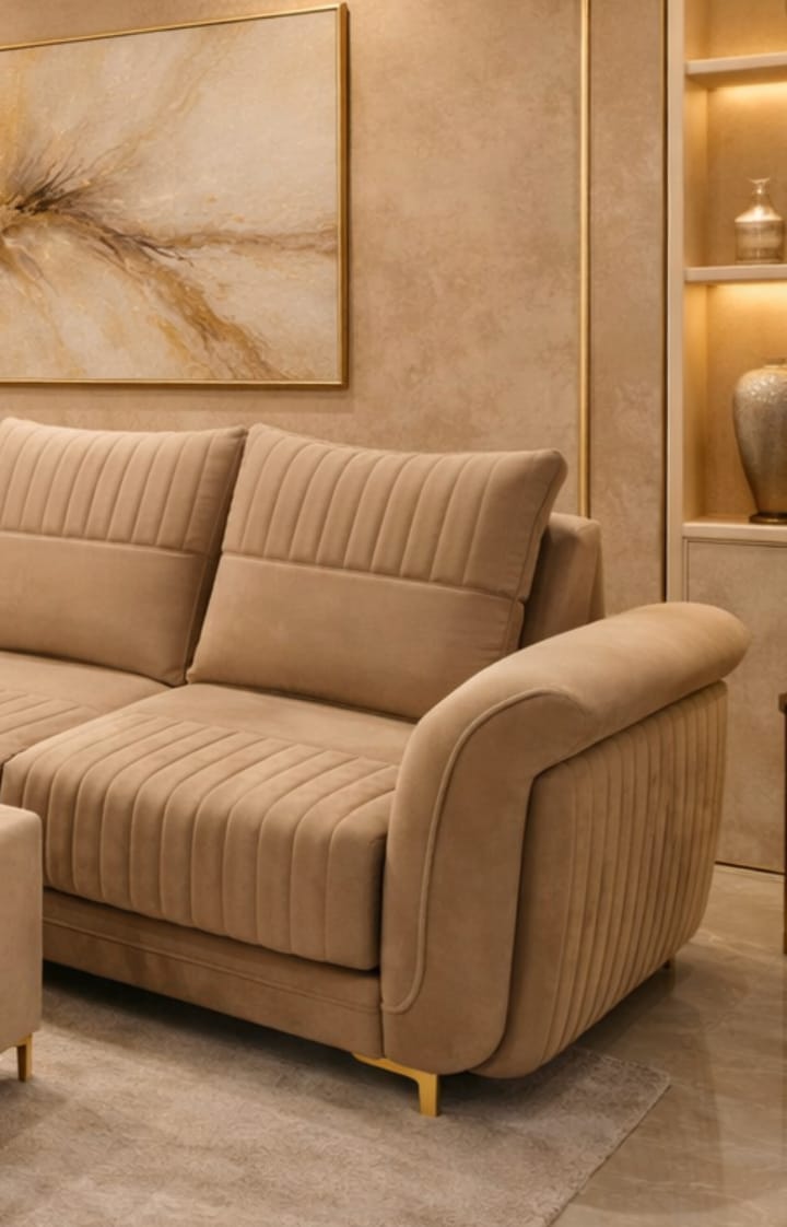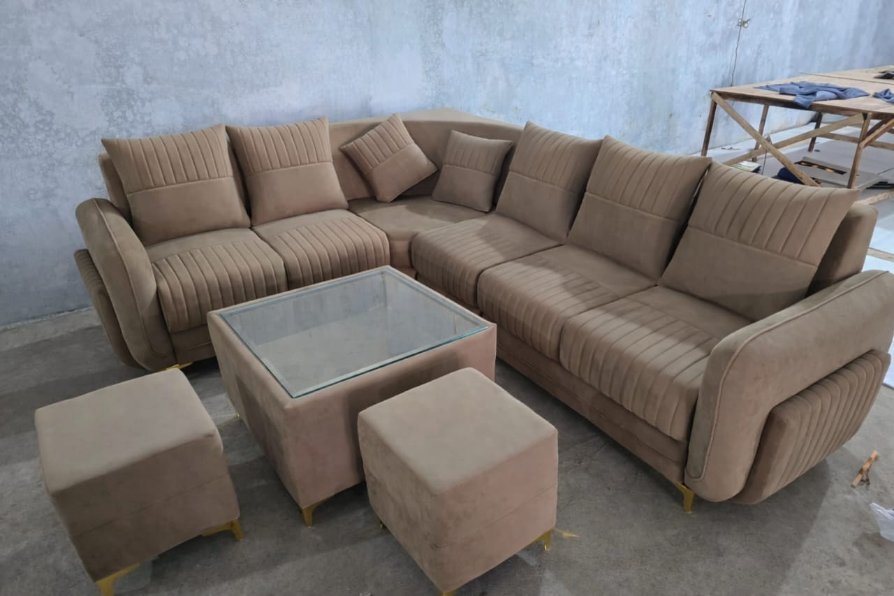 Luxury L-Shaped Sofa Set with Centre Table & PuffiesThis elegant L-shaped sofa set is designed to bring comfort, style, and versatility into your living space. Upholstered in a soothing beige tone with quilted detailing and golden accent strips, it creates a refined, hotel-style look that instantly elevates the room.The spacious L-shape layout offers generous seating, while the soft cushioning and wide armrests ensure long-lasting comfort for everyday use as well as special gatherings. The matching centre table adds functionality and completes the seating arrangement beautifully.Included with the set are two matching puffies, which can be used as extra seating, footrests, or compact coffee stools, making the sofa both practical and flexible.Overall, this sofa set is a perfect blend of luxury, comfort, and smart design, ideal for modern homes that value both aesthetics and utility.