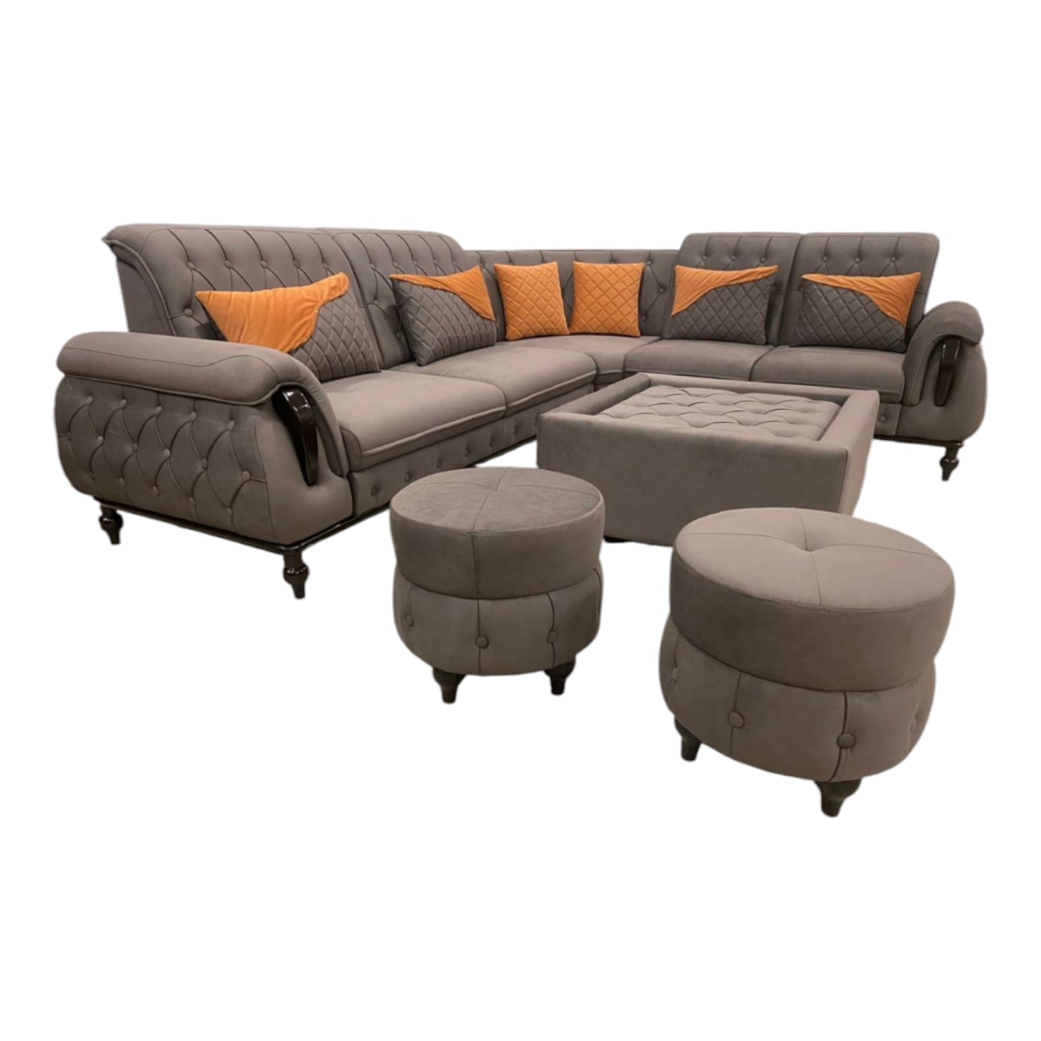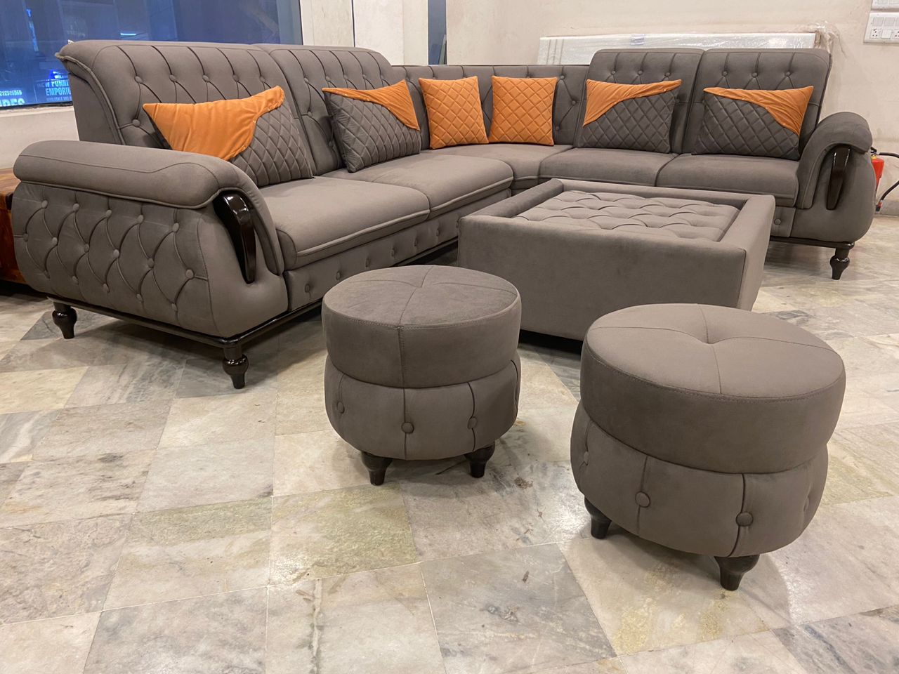 Modern Comfort with Premium CraftsmanshipIntroducing this beautifully designed L-Shaped Sofa Set with Center Table and Two Poufies, a perfect combination of comfort, luxury, and modern style. Its spacious L-shape design makes it ideal for relaxing with family and entertaining guests.Made with high-quality HR foam, the sofa provides excellent support and long-lasting comfort. It is upholstered in premium suede leather fabric, offering a soft double-touch feel and a rich, elegant appearance.The set also includes a stylish center table with a glass top along with two matching poufies, adding both functionality and a modern touch to your living space.✨ Spacious L-Shaped Modern Design✨ Premium HR Foam for Superior Comfort✨ Soft Suede Leather Fabric with Double-Touch Feel✨ Elegant Center Table with Glass Top✨ Two Matching Poufies IncludedManufactured by GHAR Furniture – Crafted with quality, comfort, and modern elegance.