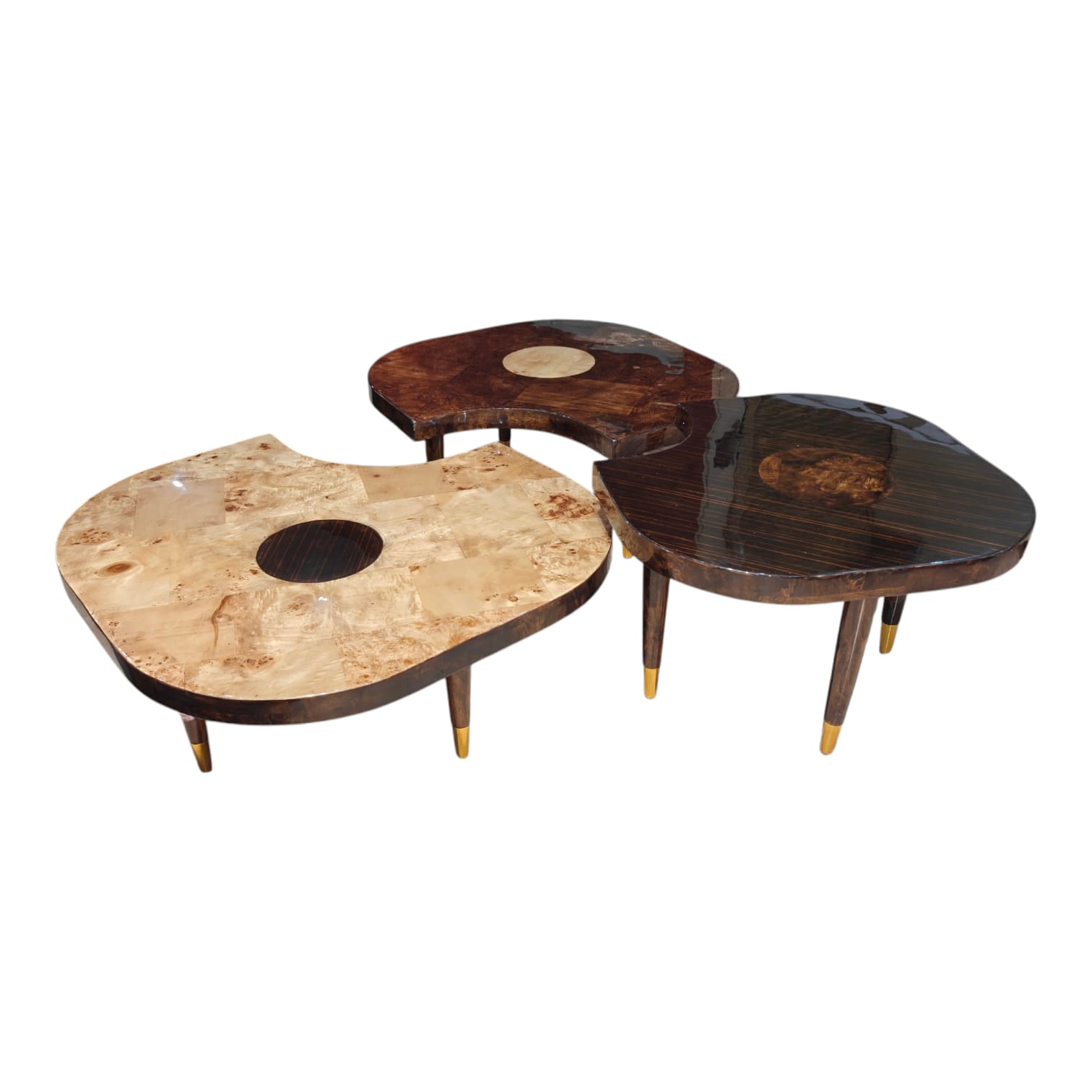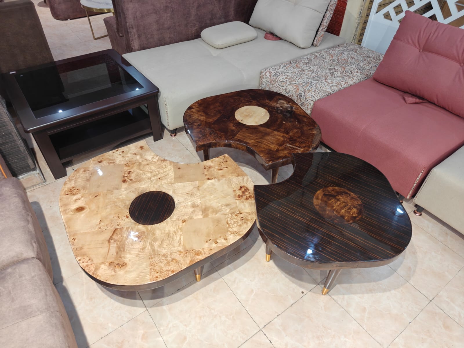 Add a touch of modern Add a touch of modern elegance to your living space with this beautifully designed three-piece center table set made in PLY and MAPPA BURL VINEER . Featuring a very unique and artistic shape, this set brings a stylish and contemporary look to your home interior. The tables are finished with high-quality polyester polish, giving them a rich shine and smooth surface that enhances their premium appeal. shine and smooth surface that enhances their premium appeal.Carefully manufactured by our own team, this exclusive design reflects fine craftsmanship and modern aesthetics. Perfect for modern living rooms, this table set offers both style and functionality.Available exclusively at GHAR Furniture.