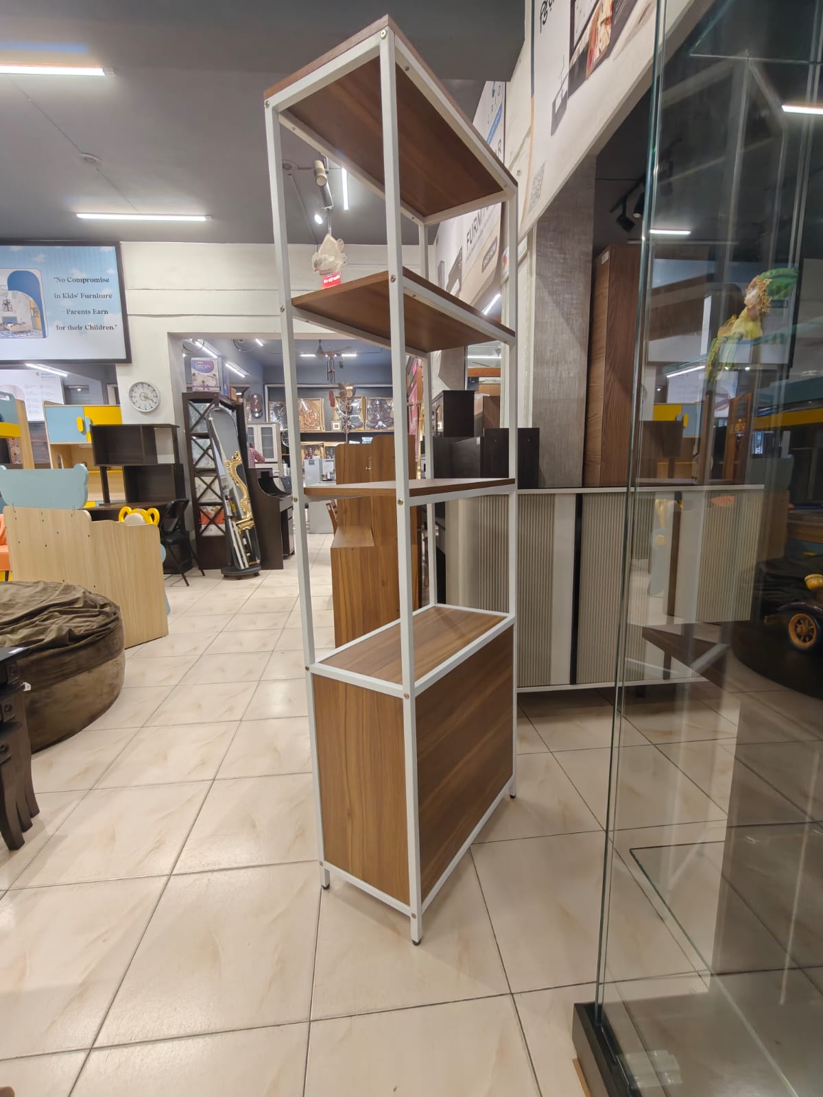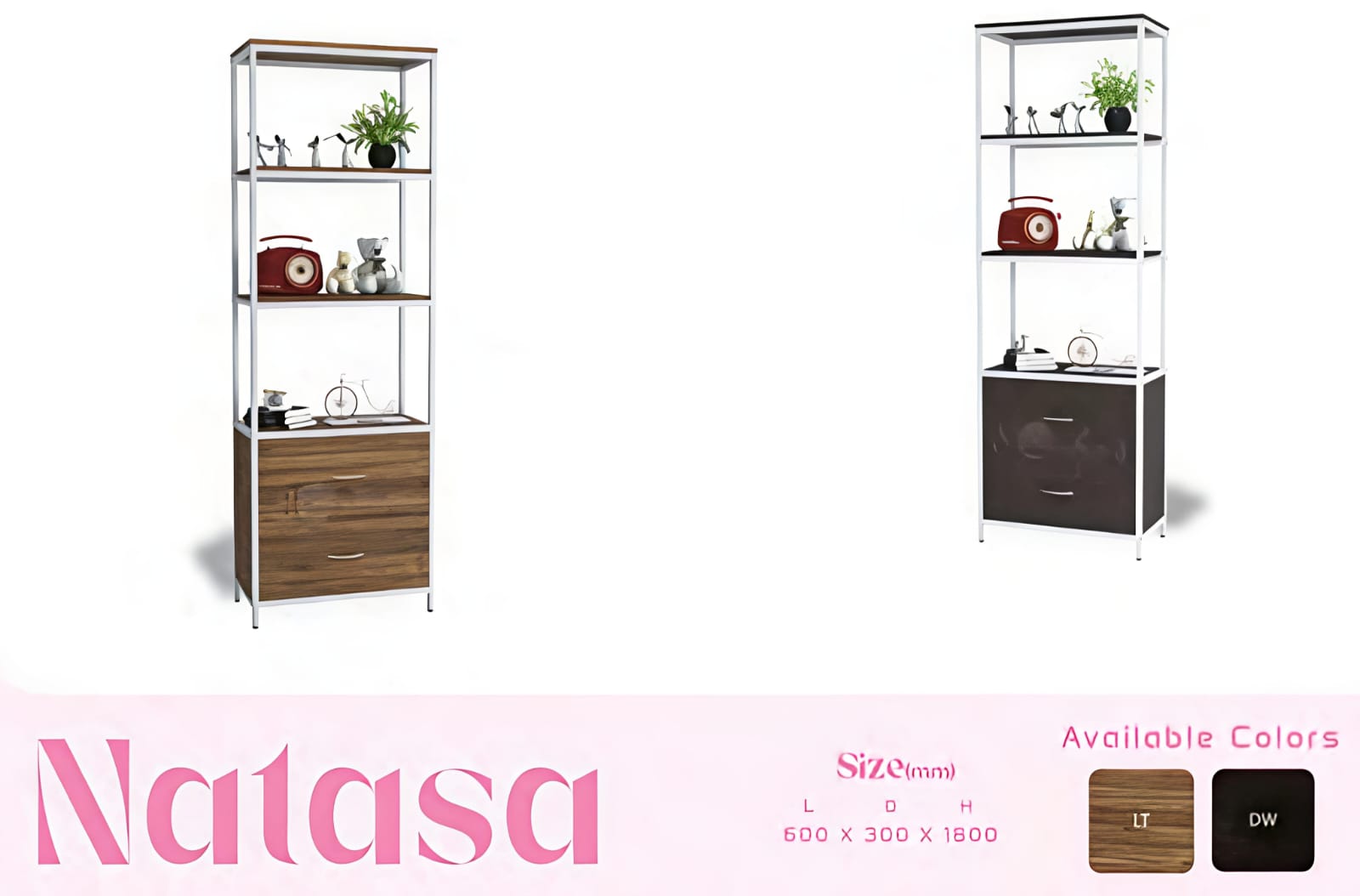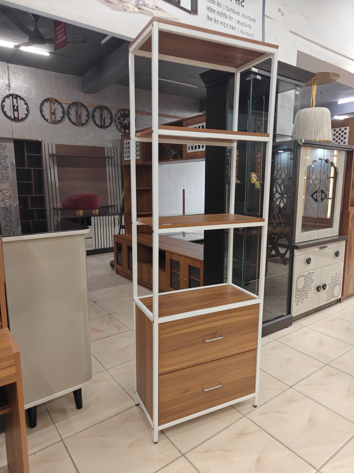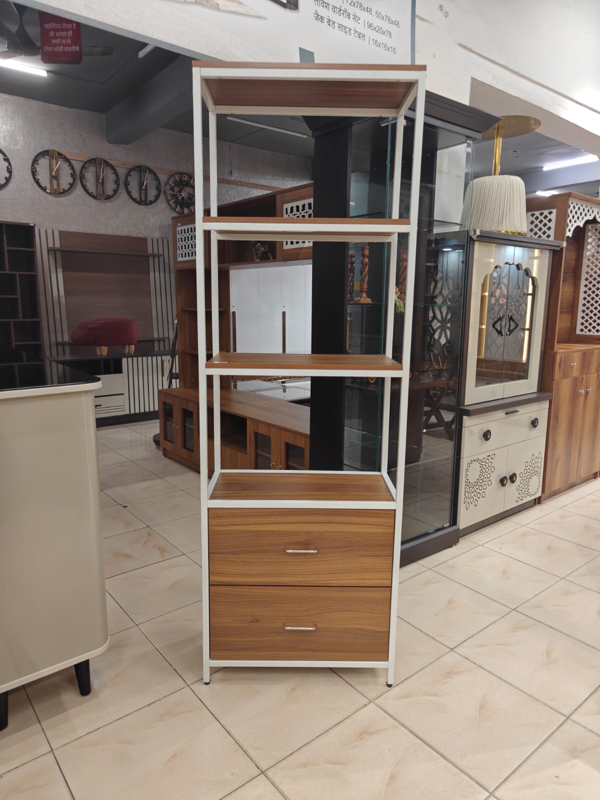 SIze - L24"x D12"x H72"Open Showcase with Drawers – Strong, Stylish & Multi-PurposeAdd elegance and smart storage to your space with our Open Showcase with Two Drawers, designed for modern interiors and everyday functionality.This showcase is made using good quality PLM board and supported by a complete heavy-duty metal frame finished with durable deco paint. The strong metal structure makes it sturdy, stable, and long-lasting.It features open shelves for display and easy access, along with two spacious drawers for organized storage. Its multi-purpose design makes it perfect for living rooms, offices, showrooms, bedrooms, and study areas.Key Features:Made from premium quality PLM boardComplete heavy metal frame for superior strengthLong-lasting deco paint finish on metalOpen shelves for display and storageTwo smooth drawers for concealed storageStrong, stable, and modern designIn-house manufactured product with strict quality standards.Available only at Ghar Furniture.A perfect combination of durability, utility, and contemporary style for any space.