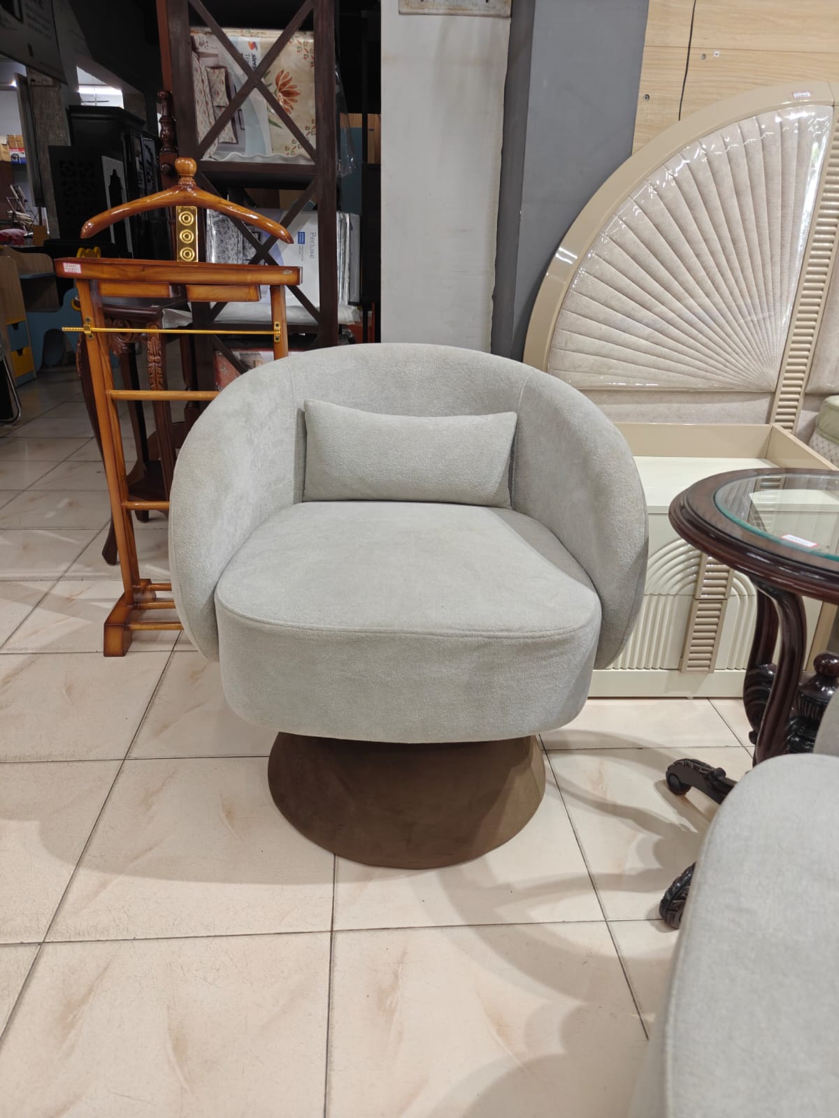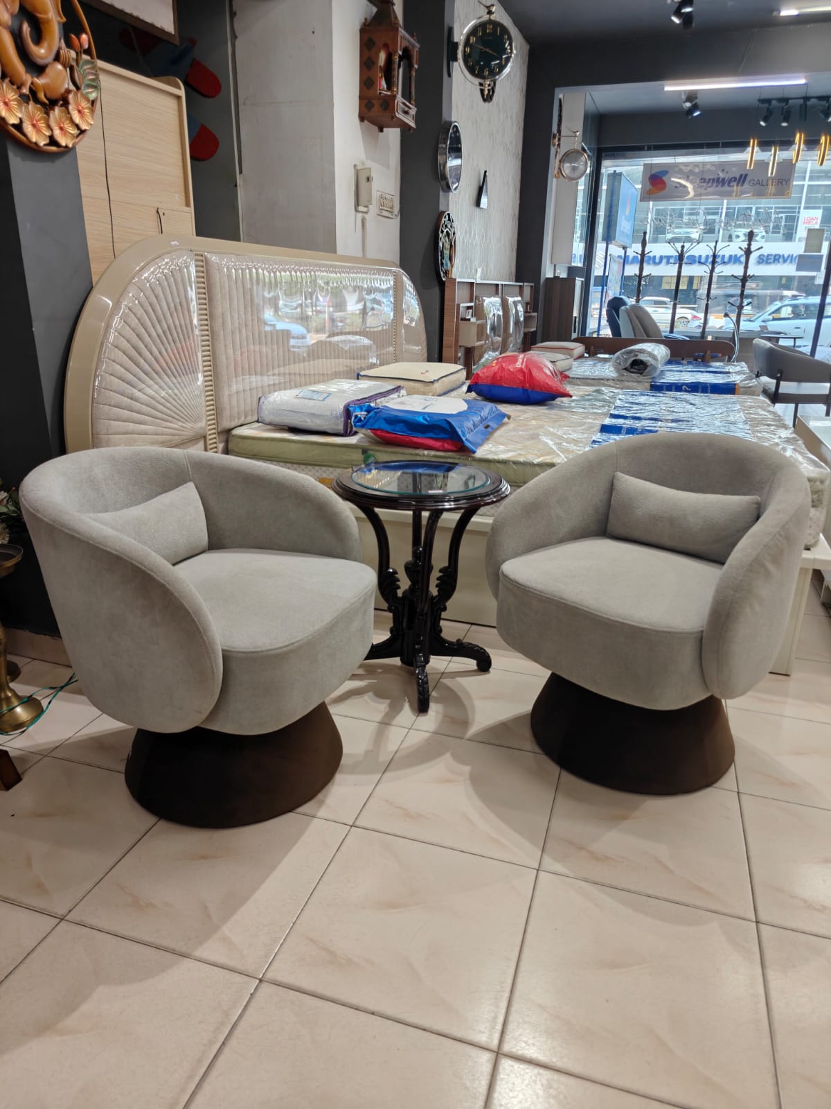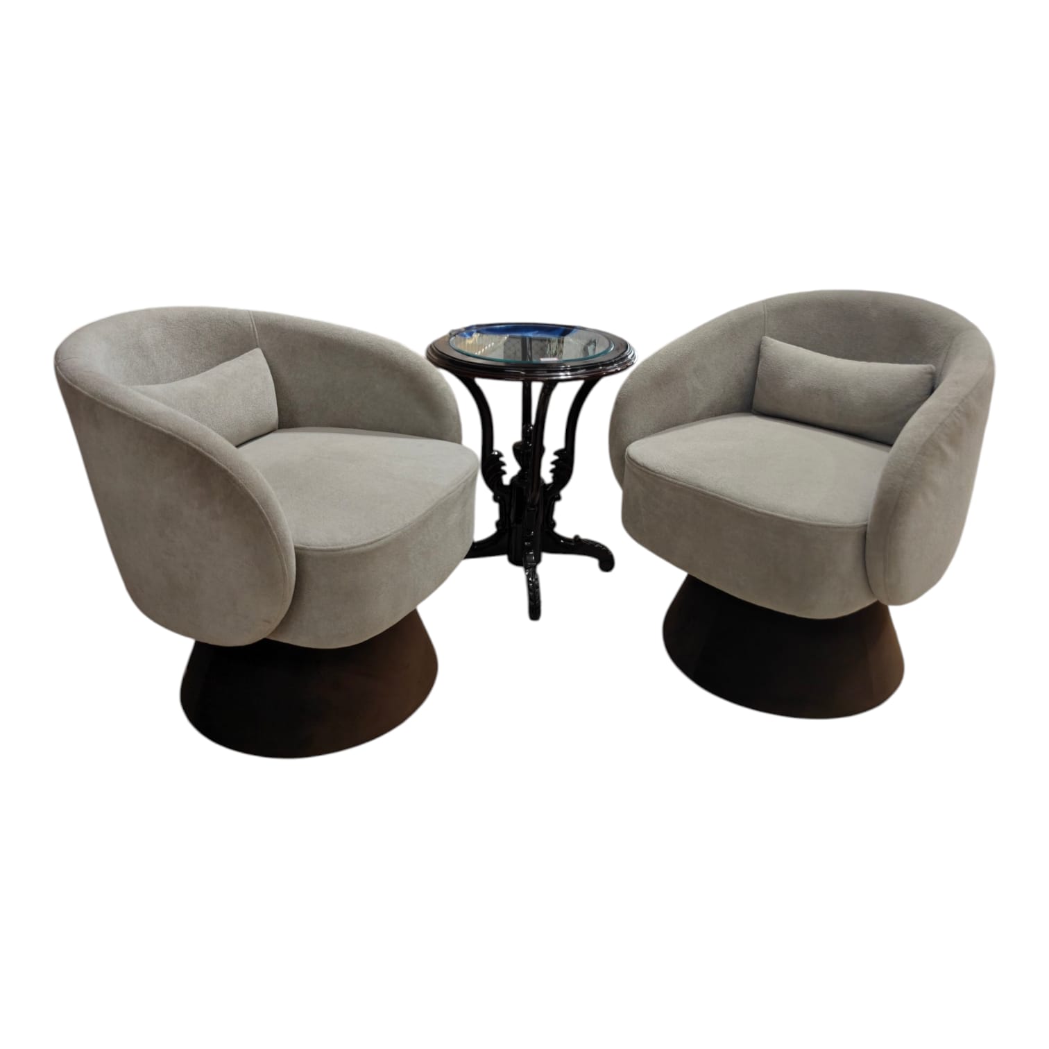 Modern Swivel Lounge Chairs – Comfort with Style ✨Add a touch of luxury to your space with this beautifully designed set of two swivel chairs, crafted with a full rotating base (360`) for effortless movement and convenience.Upholstered in premium BOUCLE fabric, these chairs offer a soft, textured feel along with high-quality cushioning that ensures exceptional comfort for long hours of seating. The unique curved design combined with a sturdy wooden base gives it a modern and sophisticated look.Designed for both style and functionality, these multipurpose chairs are perfect for:✔ Bedroom seating✔ In front of sofa sets✔ Lounge & lobby areas✔ Cozy corners and reading spacesWhether you’re relaxing or entertaining guests, these chairs bring a perfect balance of comfort, elegance, and modern design to any interior.🏡 In-house manufactured by GHAR Furniture – delivering quality craftsmanship and exclusive designs.