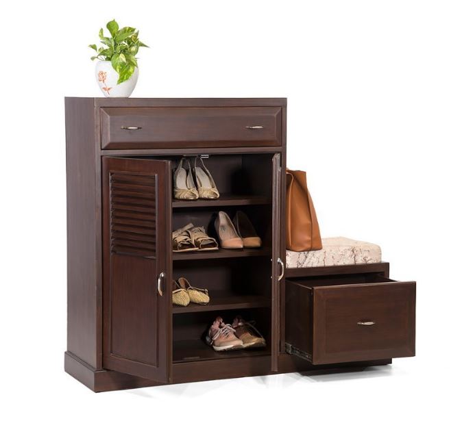 This premium shoe rack is crafted from high-quality teakwood ply with teak veneer and finished in a rich melamine walnut polish, giving it a warm, elegant look that enhances any entrance or bedroom interior.
