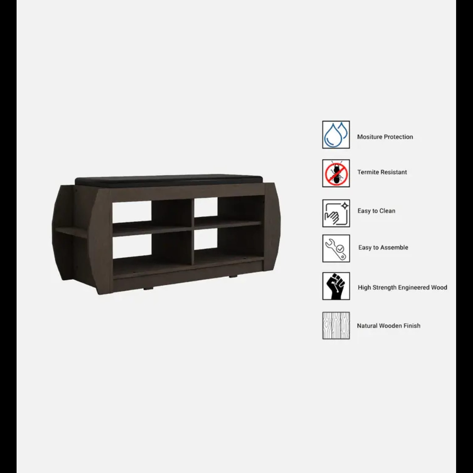 Open Shoe Rack with Sitting Cushion – Multipurpose Storage BenchThis open shoe rack is a perfect combination of comfort and utility. It comes with a soft foam cushioned seat on the top, allowing you to sit comfortably while wearing or removing your shoes. The open shelves provide easy access and organized storage for footwear, while the side shelf adds extra space for keeping daily essentials.Designed for convenience, this shoe rack can be used from both sides, making it ideal for entryways, corridors, living rooms, or bedrooms.Made from good quality PLM board, this unit is strong, durable, and long-lasting. It is manufactured in-house with fine finishing and sturdy construction.Available Colors:* Light Teak* Dark WalnutFeatures:* Open shoe rack design for easy access* Comfortable foam sitting cushion on top* Side shelf for extra storage* Can be used from both sides. Can be used in office also * Made from premium quality PLM board* In-house manufacturingAvailable at Ghar Furniture.