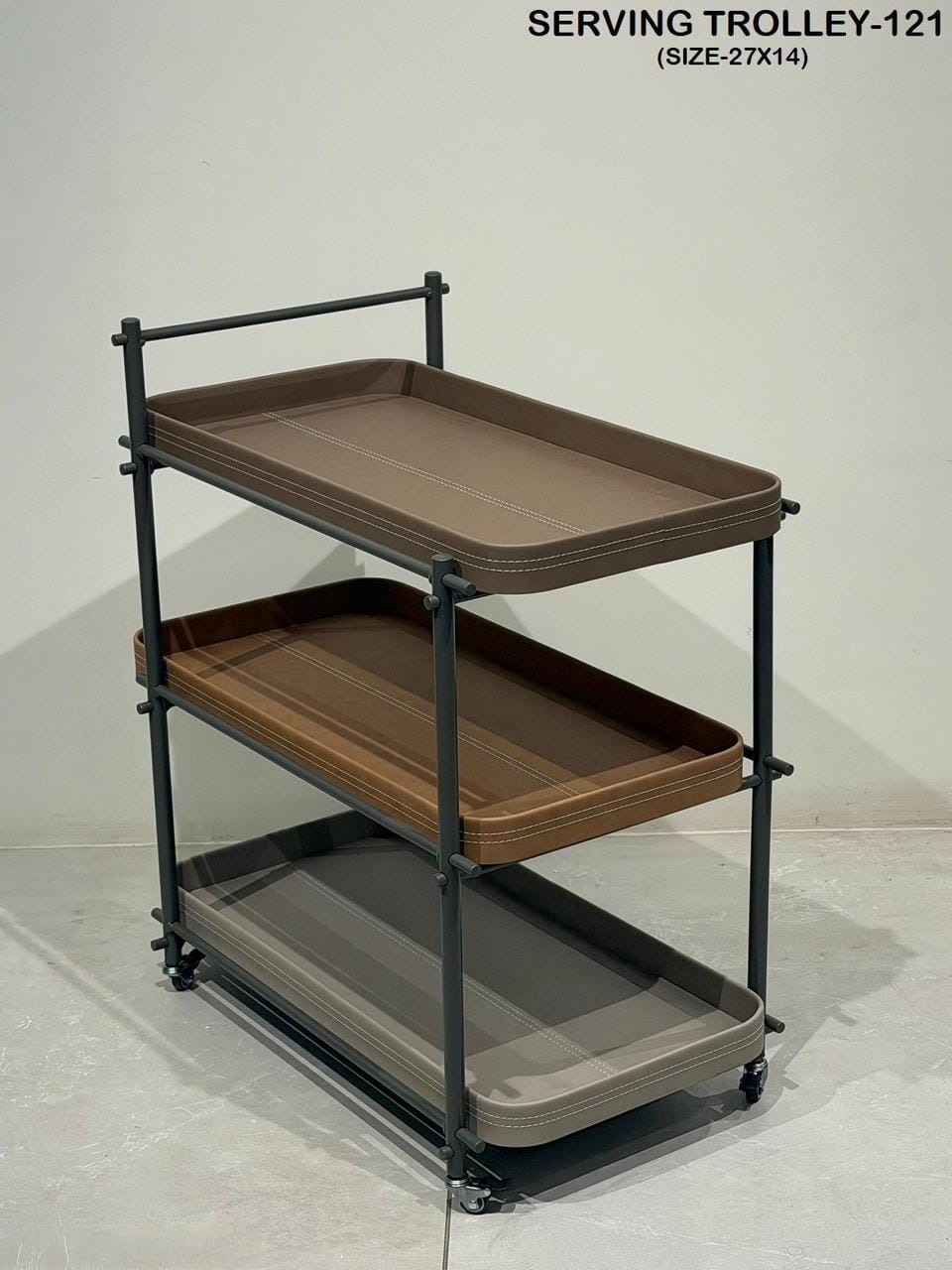 Imported Three-Shelf Service TrolleyThis elegant imported service trolley features a strong metal frame designed for durability and smooth mobility. Equipped with three spacious shelves, each tray is neatly finished with premium leatherite, giving it a refined look while ensuring easy cleaning and long-lasting use.The trolley is fitted with high-quality caster wheels for effortless movement, along with a reliable wheel lock system to keep it stable when required. Ideal for restaurants, hotels, cafés, offices, lounges, and premium home use, this service trolley is perfect for serving, storage, or display. A stylish, functional, and versatile addition to any modern interior.