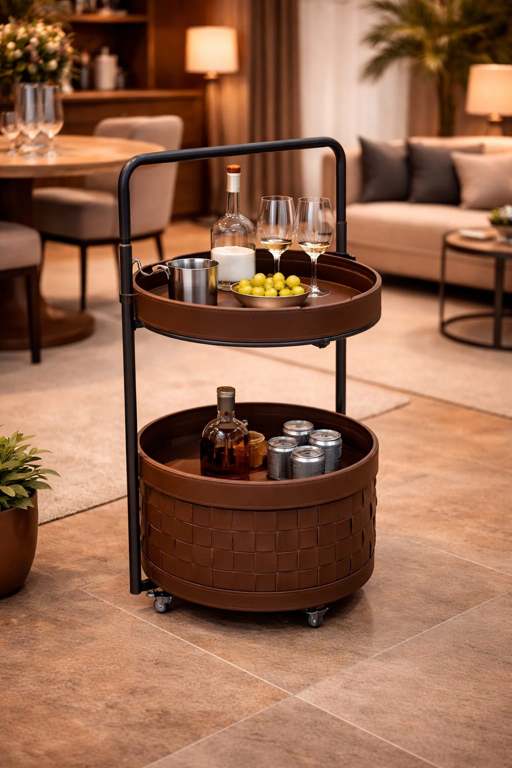 Imported Round Service TrolleyThis imported round service trolley stands out with its distinctive circular design, offering a refreshing alternative to traditional rectangular service trolleys. Crafted with a strong metal frame and finished with premium leatherite, it delivers both durability and a sophisticated look that enhances any interior.The smooth-rolling wheels ensure easy movement, while the integrated wheel lock system provides stability during serving or display. Ideal for restaurants, hotels, lounges, cafés, offices, and stylish home interiors, this round service trolley is perfect for serving beverages, snacks, or showcasing décor items. A unique, functional, and elegant piece that combines modern design with everyday convenience.