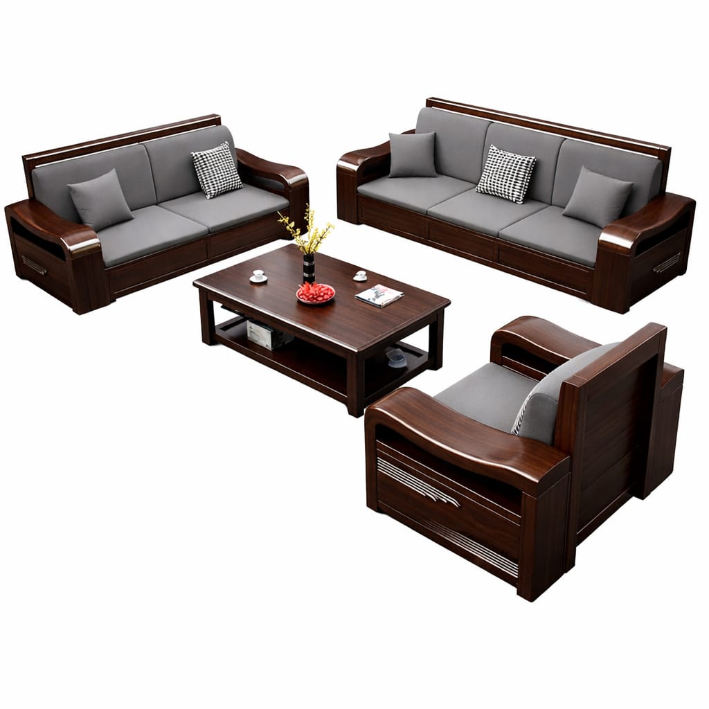 Elegant 3+2+1 Teak Wood Sofa Set with Center TableBring home timeless elegance with this beautifully crafted 3+2+1 seater sofa set, designed to elevate your living space with warmth, strength, and style. Made for true wood lovers, this sofa set showcases a perfect balance of classic craftsmanship and modern comfort.The entire structure is crafted from high-quality teak wood, combined with ISI-graded commercial gridded ply, ensuring superior durability, long life, and excellent load-bearing strength. Finished with premium teak veneer and protected by a rich melamine polish, the set offers a smooth surface, enhanced grain definition, and long-lasting resistance to daily wear.Plush, well-cushioned seating provides exceptional comfort, while the solid wooden armrests add a bold and luxurious character. The matching center table, designed in the same finish, completes the set and adds functionality with a cohesive aesthetic.Key Features:Configuration: 3-seater + 2-seater + 1-seater with center tableMaterial: Solid teak wood frameCore: ISI-gridded commercial ply for extra strengthFinish: Teak veneer with premium melamine polishDesign: Elegant wooden armrests with contemporary comfortDurability: Strong, sturdy, and ideal for long-term useThis sofa set is perfect for modern and classic living rooms alike, offering luxury, comfort, and reliability in one complete package.